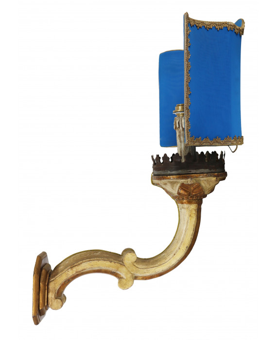 Braccio portacero in legno laccato e dorato ed intagliato a volute contrapposte. Italia, inizi sec.XIX. Lungh. cm50 (lievi mancanze ed elettrificato)