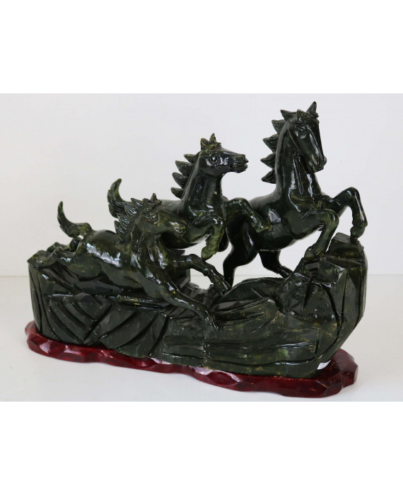 Gruppo scultoreo in giada verde raffigurante cavalli in corsa, su base in legno. Lungh. cm40
