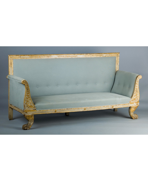 Divano a tre posti in legno laccato e dorato con serti vegetali e fiori, gambe anteriori a zampa, seduta e spalliera rivestite in stoffa. Italia, inizi sec. XIX (difetti e mancanze alla laccatura)