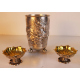 Lotto di un elegante vaso in argento 925 interamente sbalzato con scena di caccia al leone, su tre peducci a sfera ed una coppia di salierine in argento, bordo mistilineo, interno in vermeille e peduccio a fiore, bolli Londra 1868 - 69, argentiere Hunt & Roskeli. Alt. cm17; diam. cm9. Peso tot. gr. 760