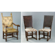 Lotto di una poltrona in legno di noce con gambe e traverse tornite a rocchetto, braccioli a ricciolo, fiamme superiori dorate e seduta e spalliera rivestite in stoffa ed una coppia di sedie in legno di noce con gambe e traverse tornite a rocchetto, seduta rivestita in stoffa e schienale in pelle. Italia centrale, sec. XVII (difetti e mancanze)