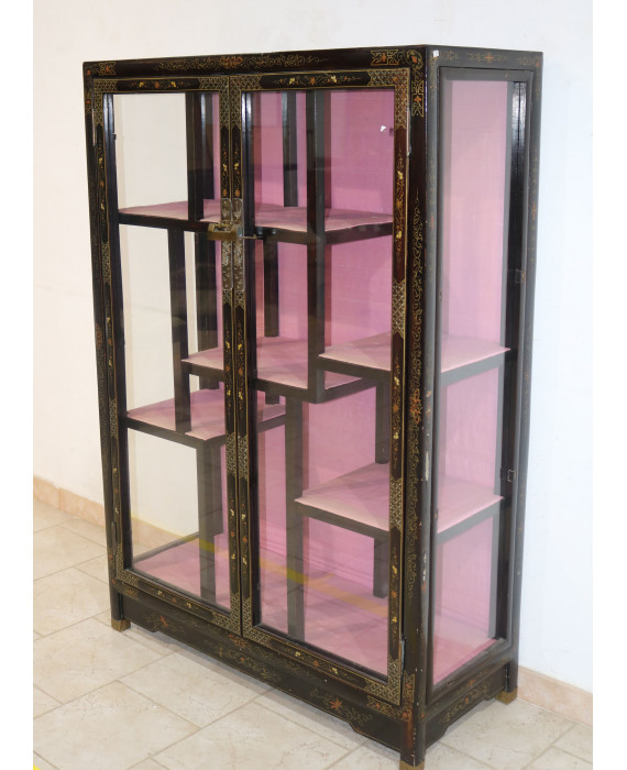 Vetrina a due sportelli in legno ebanizzato, decorata e dipinta con motivi geometrici e floreali. Cina, sec. XX. cm145x98x40