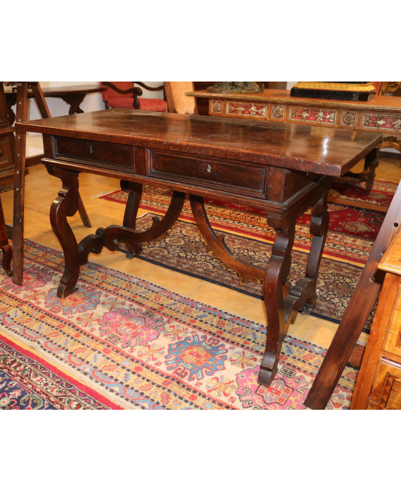 Tavolo scrittoio in legno di noce, due cassetti, due sostegni a lira raccordati da traverse. Italia , sec. XVII. cm81x133x64 (lievi difetti)