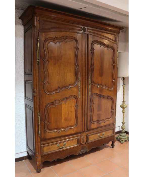 Armadio a due ante in legno di rovere con fronte e laterali riquadrati e cardini in bronzo dorato, due cassetti inferiori. Provenza, sec. XVIII. cm237x184x60 (difetti)
