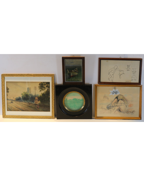 Lotto di cinque opere: Mini Maccari. Studio di figure. China su carta, firma in basso con cornice. Artista del sec. XX. Aria-terra-acqua-fuoco. disegno ad acquarello e china, sul retro descrizione del dipinto, con cornice. F. Church, sec. XX. Scorcio di citta' con viandanti, 1913. Acquarello su carta, firma e data in basso a sinistra, con cornice. Artista del sec. XX. Paesaggio campestre. Acquarello su carta, monogramma B in basso a destra, con cornice. Artista del sec. XX. Marina con barca. Olio su cartone telato, con cornice (cm16x11) (lieve caduta di colore)