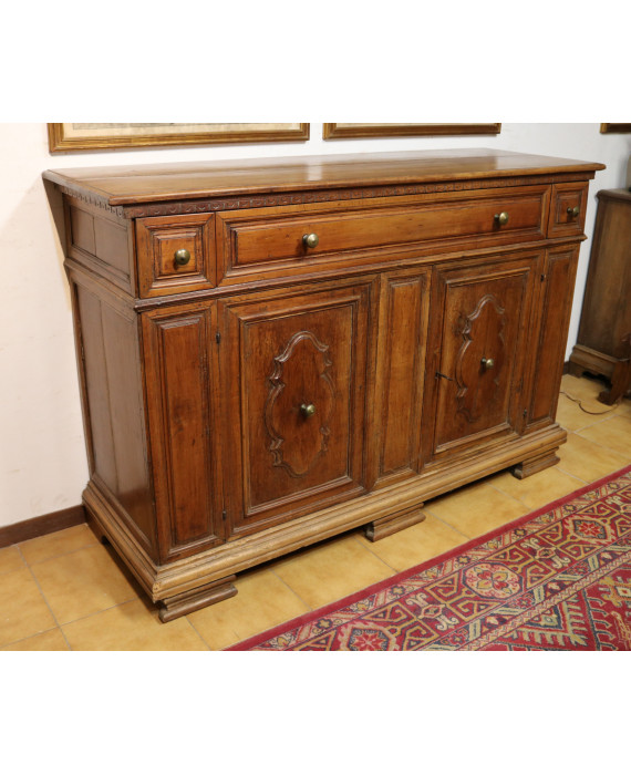 Antica credenza in legno di ciliegio, tre cassetti superiori e due sportelli riquadrati. cm110x167x55