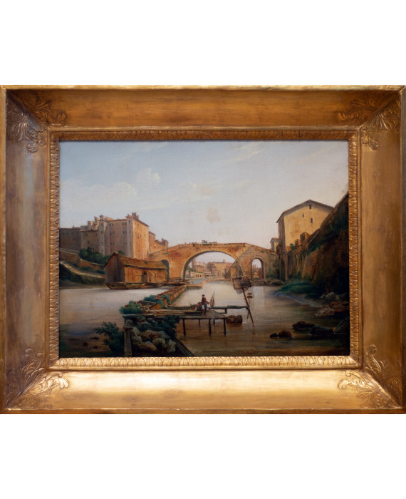 Veduta dell'antico ponte Cestio (demolito nel 1888) con l'Isola Tiberina, entro cornice coeva