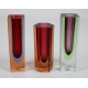 Lotto di tre vasi monofiore in vetro sommerso di Murano nei toni del rosso e melanzana. Alt. cm15(2)/13