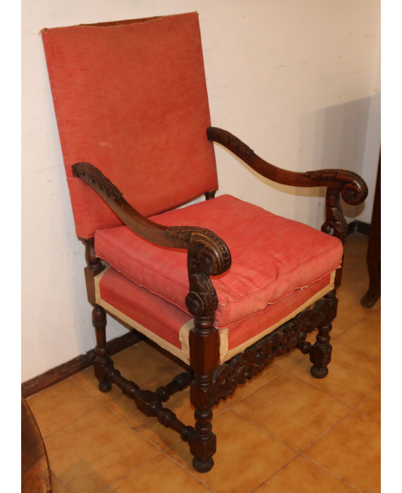 Poltrona in legno noce, braccioli a ricciolo, traversa intagliata e traforata a volute vegetali, gambe e traverse tornite, seduta e spalliera rivestite in stoffa (difetti alla stoffa)