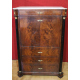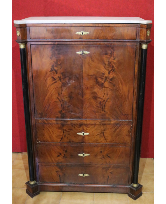 Secretaire lastronato in legno di mogano, un cassetto superiore, calatoia con all'interno due specchierine centrali, tre cassetti e tre segreti, tre cassetti inferiori, colonne laterali ebanizzate e piano superiore in marmo. Italia, periodo dell'Impero. cm154x105x48 (difetti)