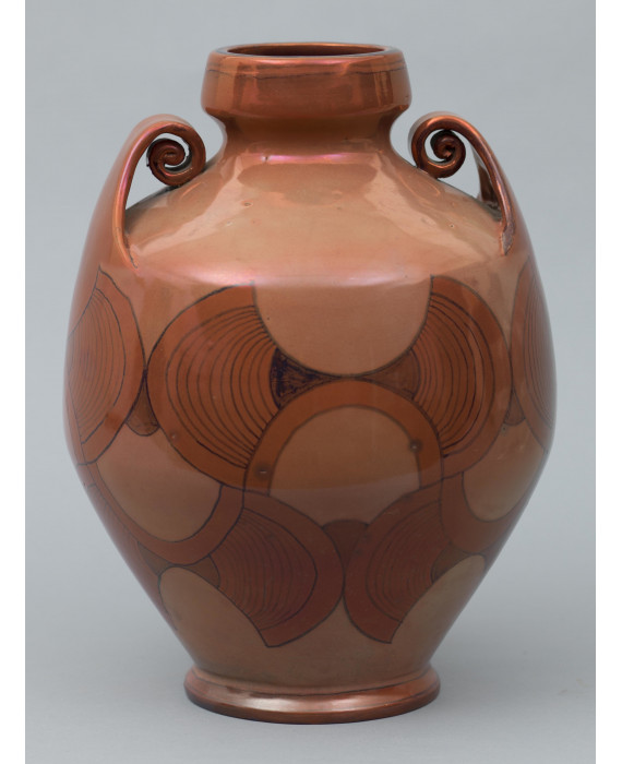 Vaso biansato in maiolica a lustro nei toni del viola, dipinto a motivi geometrici, firmato sul fondo Bottega Gatti Faenza. Alt. cm37