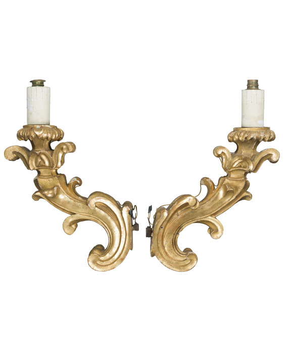 Coppia di bracci porta cero in legno dorato intagliati con volute rocaille. Italia, sec. XVIII. Lungh. cm62 (difetti e mancanze alla doratura)