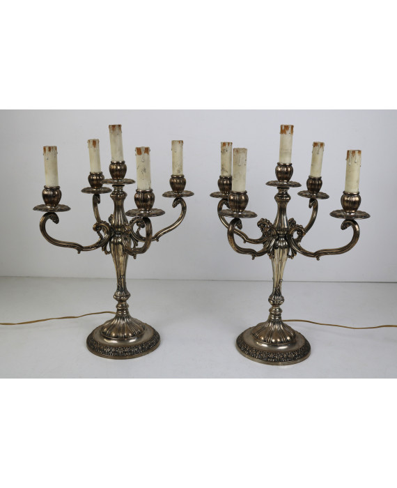 Coppia di candelabri a cinque fiamme in argento adattati a lampada, con bracci a voluta e fasce lavorate con serti vegetali. Alt. cm40. Peso tot. del solo argento gr. 2600 circa (assenza di bolli e possibile piombatura interna)