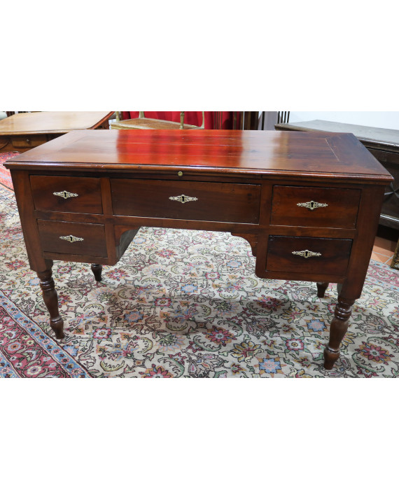 Scrivania da centro in legno di ciliegio, cinque cassetti, quattro gambe tornite, un tiretto. Italia, sec. XIX. cm80x125x62