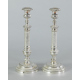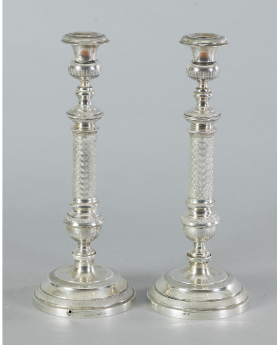 Coppia di candelieri in argento 800 con fasce incise a palmette e fiori stilizzati, fusto a colonna tornita terminante a vaso. Alt. cm32. Peso tot. gr. 820 (fori per elettrificazione)