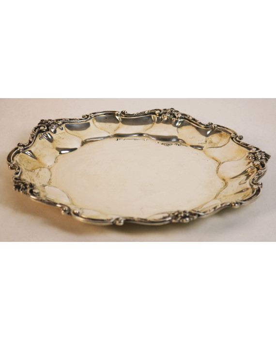Vassoio in argento 900 con tesa costolata e bordo mistilineo lavorato con volute vegetali e mascheroni. Italia, inizi sec. XX, argentiere Enrico Messulam. Diam. cm34. Peso gr. 1065
