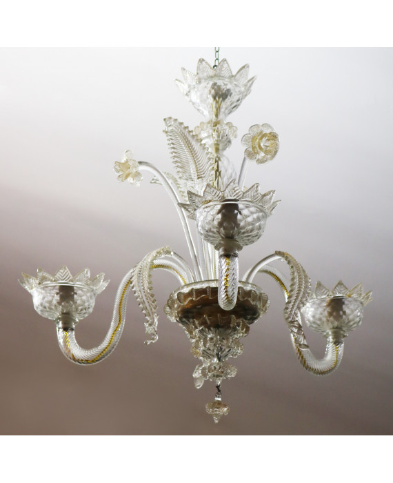 Lampadario a tre luci in vetro trasparente di Murano (mancante di un elemento)