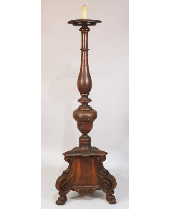 Grande torciere da terra in legno tinto noce con base a tre appoggi a zampa ferina e fusto tornito. Italia, sec. XVIII. Alt. cm163 (presente vecchia elettrificazione)