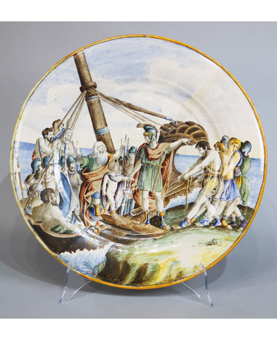 Grande piatto in maiolica dipinta raffigurante scena classica con nave e personaggi. Italia, sec. XIX. Diam. cm52 (restauri)