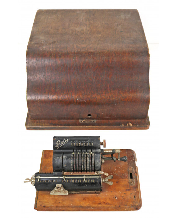 Lotto di una calcolatrice di marca Thales degli anni '20 ed una vecchia macchina da scrivere con custodia in legno (difetti)