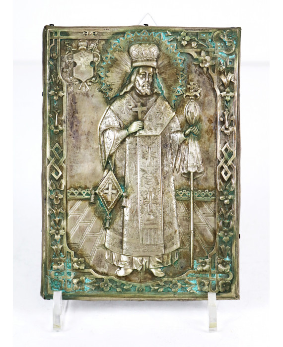 Piccola icona sbalzata in argento con Santo e stemma inciso con aquila bicipite. Bolli Russia, sec. XIX. cm16x12