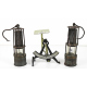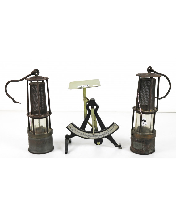 Lotto di una bilancia postale da tavolo ed una coppia di lanterne in metallo del sec. XIX. Alt. cm22/24/26 (lievi difetti)