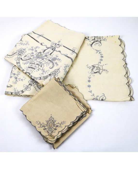 Tovaglia in tessuto ricamato, completa di dodici tovaglioli