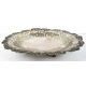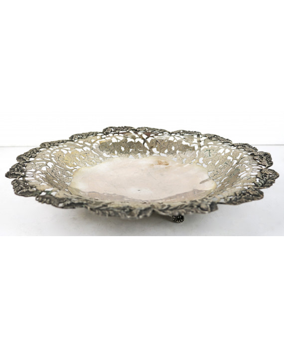 Centrotavola in argento 800 con tesa traforata a tralci d' uva e serti floreali. Diam. cm36. Peso gr. 775 (difetti)