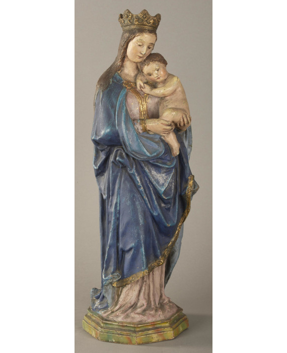 Madonna con Bambino in terracotta dipinta con base ottagonale a finto marmo, sul fondo firma illeggibile e data 26 maggio 1881. Alt. cm55