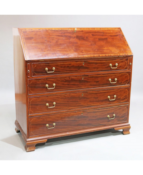 Ribalta in legno di mogano, calatoia con all'interno sette cassettini ed uno sportello rivestito in acero e piano foderato in pelle, quattro cassetti inferiori. Inghilterra, periodo vittoriano. cm106x114x55