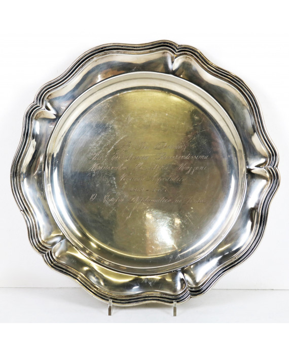 Vassoio in argento 925 con bordo mistilineo ed iscrizione centrale incisa. Diam. cm44. Peso gr. 1175