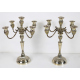 Coppia di candelabri a cinque fiamme in argento 800, fasce baccellate, bracci a voluta, basi circolari. Alt. cm33. Peso tot. gr. 1460