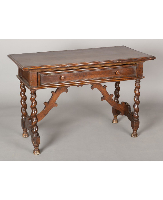 Scrittoio in legno di noce, un cassetto, quattro gambe a tortiglione raccordate da traversa intagliata a volute. Italia centrale, sec. XVII. cm77x117x58
