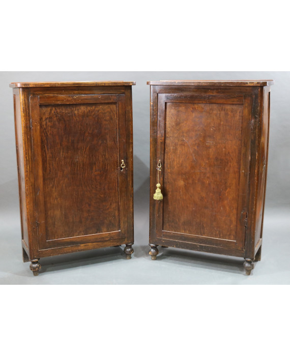 Coppia di credenzine ad uno sportello in legno di noce. cm122x76x33 (difetti)