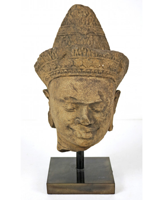 Testa di Buddha sorridente in arenaria, su piedistallo. Thailandia, sec. XX. Alt. cm30
