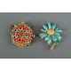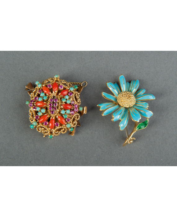 Lotto di una spilla in oro giallo 18 kt a forma di fiore con smalti ed una chiusura per collana in oro giallo 18 Kt con rubini, corallo e turchese. Peso spilla gr. 12,65; peso chiusura gr. 20,7. (collana mancante di un rubino). Allegata dichiarazione di autenticità del perito ed esperto, specializzazione preziosi, Federico Perinelli