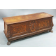 Cassapanca in legno di noce fronte riquadrato in radica di noce con stemma araldico centrale e paraste intagliate a serti vegetali. Italia, sec. XVIII. cm55x150x53