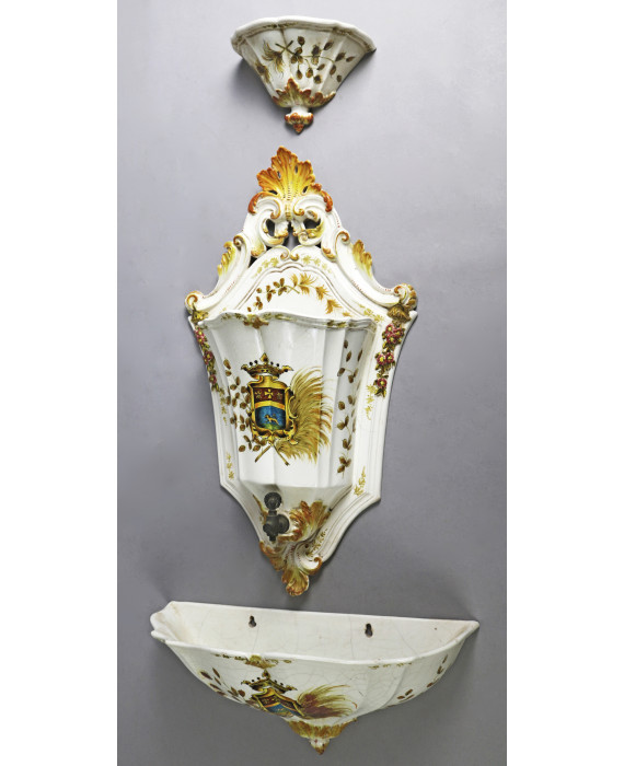 Lavamani da parete in ceramica dipinta con stemma araldico composto da contenitore con rubinetto e bacile.