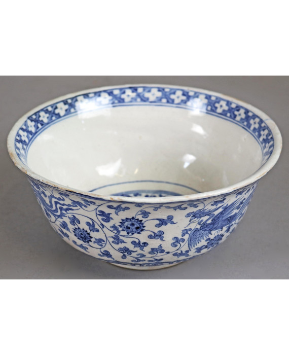 Ciotola in terraglia smaltata e dipinta in blu con fenici e serti floreali. Manifattura orientale, sec. XX. Diam. cm21 (lievi scheggiature)