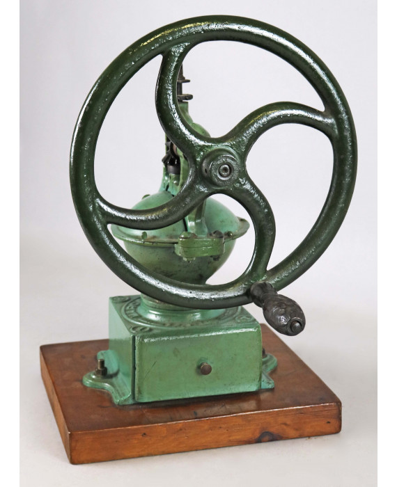 Grande macinino a volano in ghisa con cassetto in legno di marca Bartolomeo Trucchetti (BT), su base in legno. Alt. cm42 (usure del tempo)