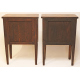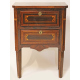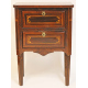Coppia di comodini a due cassetti impiallacciati in legno di mogano ed interamente intarsiati in legni vari. cm84x58x32 (lievi difetti)