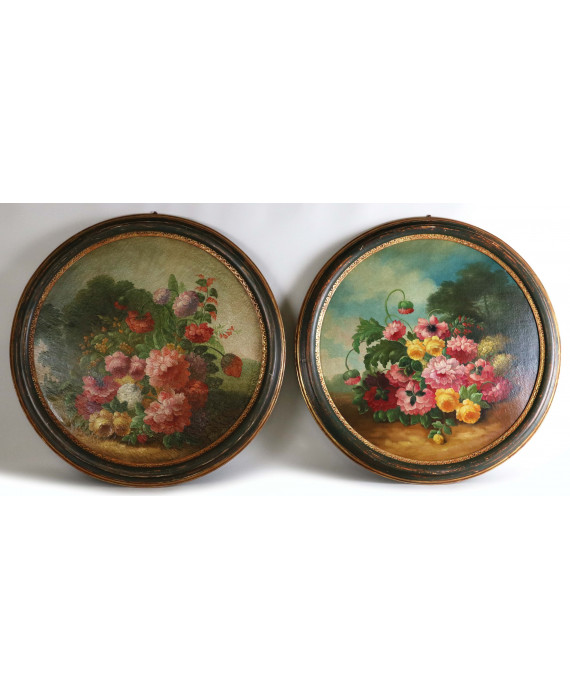 Tecnica: Coppia di dipinti tondi ad olio su tela incollate su tavolaDimensioni: diam. cm57