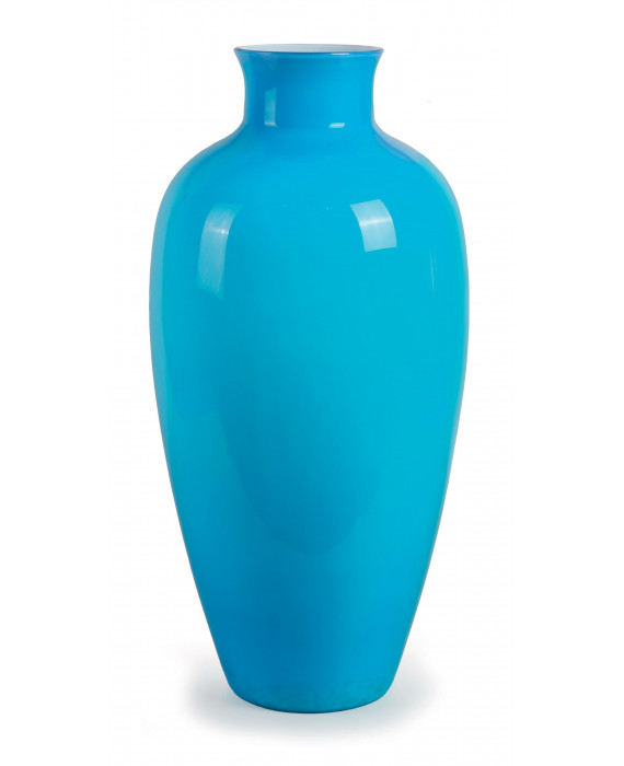 Grande vaso modello Labuan in vetro di Murano incamiciato a fondo celeste, firmato sul fondo Venini 88. Alt. cm63
