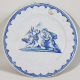 Piatto in maiolica a fondo bianco dipinta in blu con Annunciazione. Sul fondo lettere A M O graffite. Liguria, fine sec. XVIII. Diam. cm34 (lievi scheggiature)