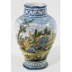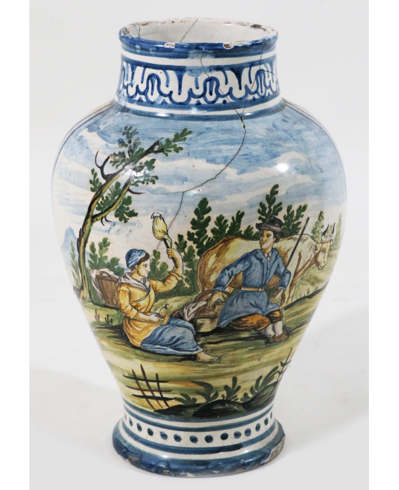 Vaso in maiolica dipinta con scena agreste e personaggi, sul retro motivi vegetali con monogramma F.R. manifattura del sud Italia, sec. XIX. Alt. cm32 (filature e restauri)