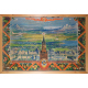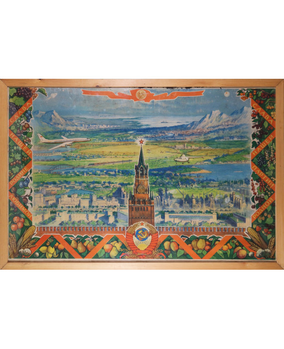 Manifesto propagandistico sovietico che celebra i successi dell'Unione Sovietica raffigurante il Cremlino di Mosca al centro, circondato da un paesaggio idealizzato che include città moderne, infrastrutture industriali, aerei ed elicotteri, simboleggiando il progresso tecnologico e industriale, alla base è presente l'emblema di stato dell'URSS (falce e martello con spighe di grano), simbolo dell'unione tra operai e contadini.