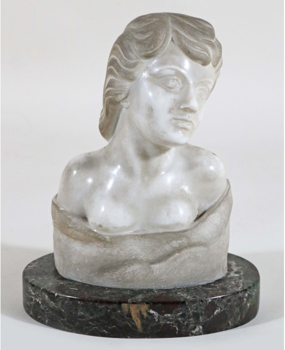 Busto femminile in marmo bianco su base in marmo brecciato, firmato sul retro A. Delfino. Alt. cm23