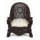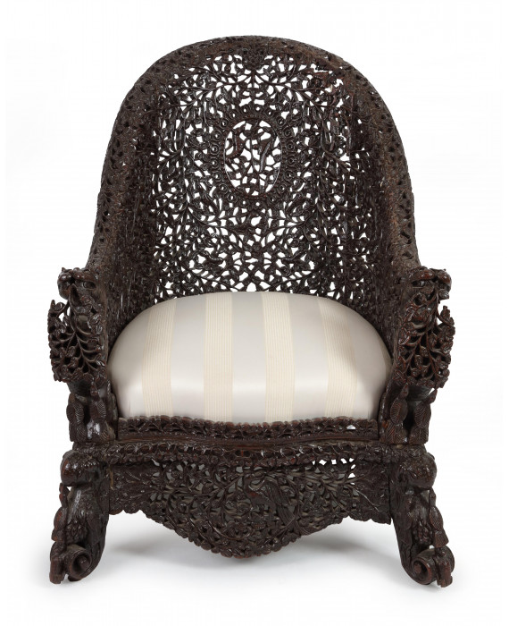 Particolare poltrona in legno interamente intagliato e traforato con serti vegetali e animali, braccioli terminanti a testa di drago, sostegni con peduccio a ricciolo, seduta rivestita in stoffa. Manifattura anglo-indiana, sec. XIX (piccole mancanze)