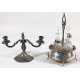 Lotto di un'oliera in argento con bolli non identificati, con quattro ampolle in vetro ed un candelabro a due fiamme in argento 800. Peso dell'oliera gr.440