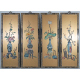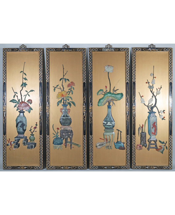 Serie di quattro pannelli realizzati su fondo oro, impreziositi da elementi figurativi a rilievo in pietre dure raffiguranti composizioni floreali entro vasi orientali. Arte orientale del sec. XX